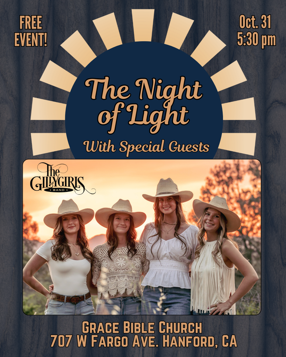 Join Grace Bible Church Hanford for a fun night featuring The Gilly Girls Band! This is a family friendly event that includes a light maze, live music, free food, games, and more! Sign-up to make sure you get a meal and a flashlight for the light maze: https://docs.google.com/forms/d/e/1FAIpQLSdxSqzwtyH614ux4QqhBlfHldW79Z-m12MfysrBl3BFwIELlA/viewform?usp=header