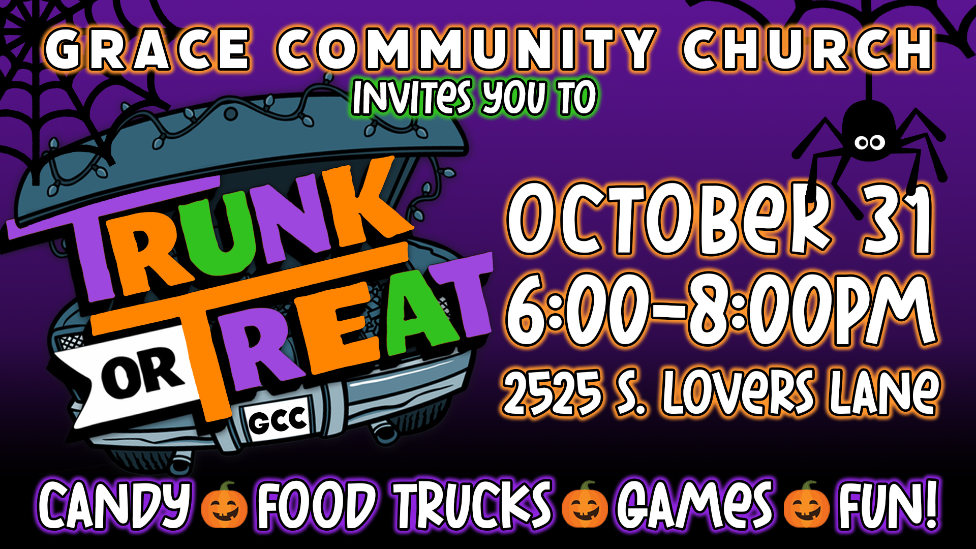 Join us for our annual Trunk or Treat on Friday, October 31st from 6:00 PM to 8:00 PM in the Grace Community Church parking lot! Bring the whole family for an evening full of games, candy, food trucks, and festive fun. This free community event is open to all ages—just come ready for treats and smiles! (Please note: while entry ... Read More
