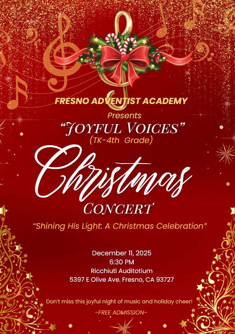 "Joyful Voices" Christmas Concert (Featuring Tk-4th grade) @ Fresno Adventist Academy (A Christian School) Date: December 11th Time: 6:30pm Location: 5397 E. Olive Ave., Fresno CA 93727 Fresno Adventist Academy (a Christian School in South-East Fresno) would be honored to invite you and your family to their Annual Christmas Concerts; musical celebrations of the birth of our Savior, Jesus Christ. These special evening programs will feature inspiring ... Read More