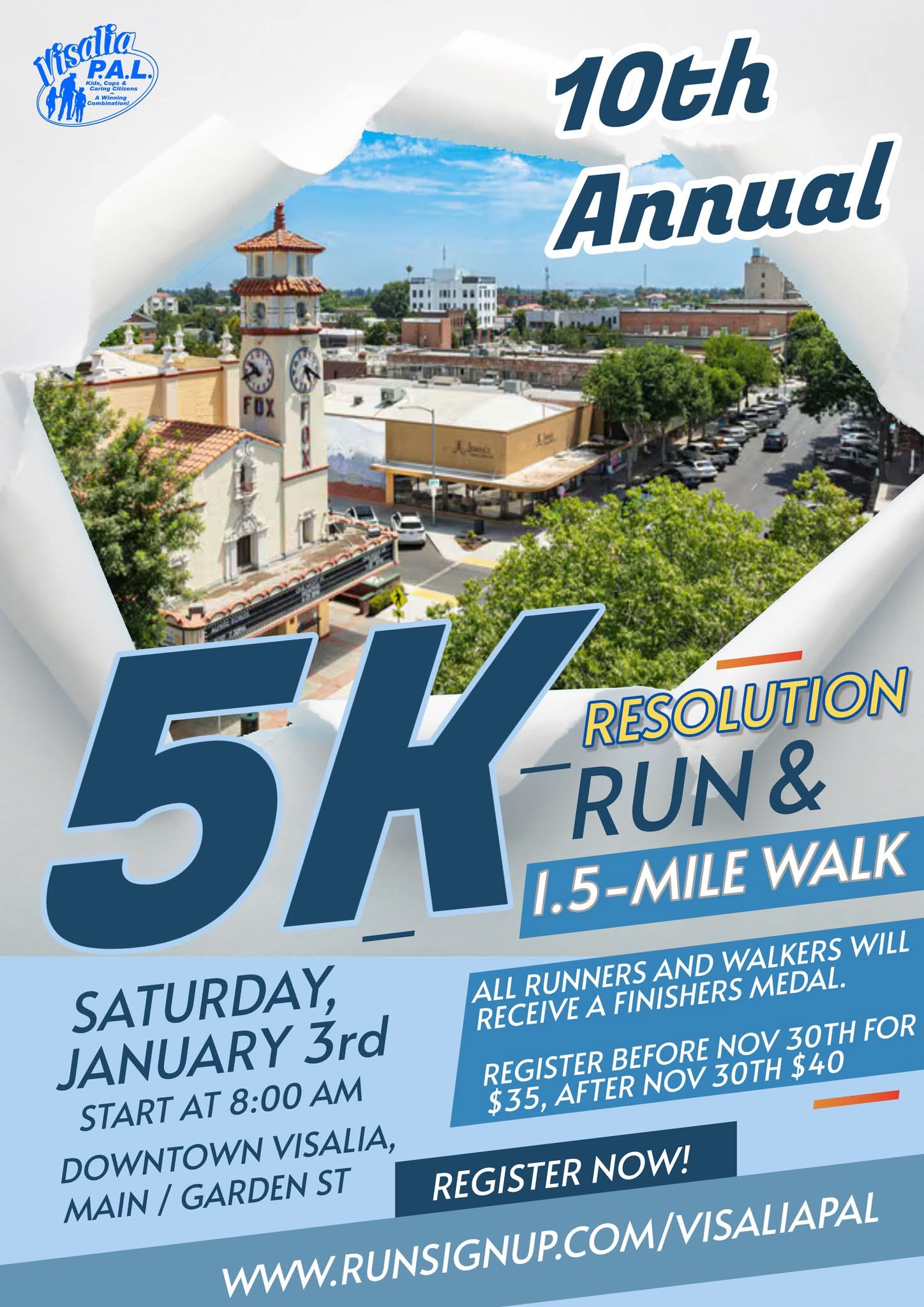 Saturday, January 3 Downtown Visalia - Start time at 8:00 A.M. All runners and walkers will recieve a finishers medal! Register now at www.runsignup.com/visaliapal
